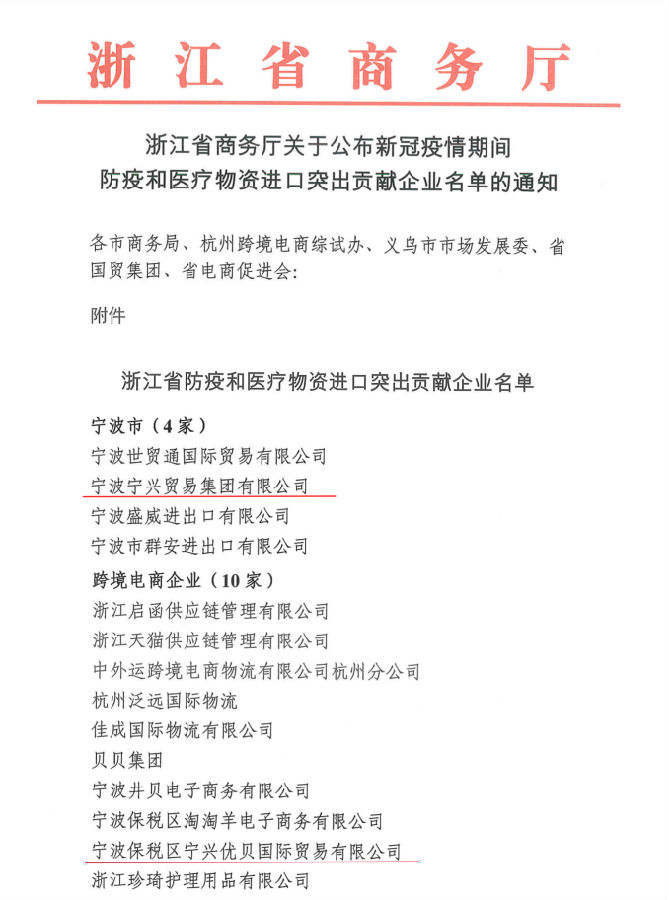 日前,英国365集团公司所属英国365集团公司贸易集团、英国365集团公司优贝获评浙江省商务厅表彰的新冠疫情期间防疫和医疗物资进口突出贡献企业。宁波市仅有七家企业获此殊荣。