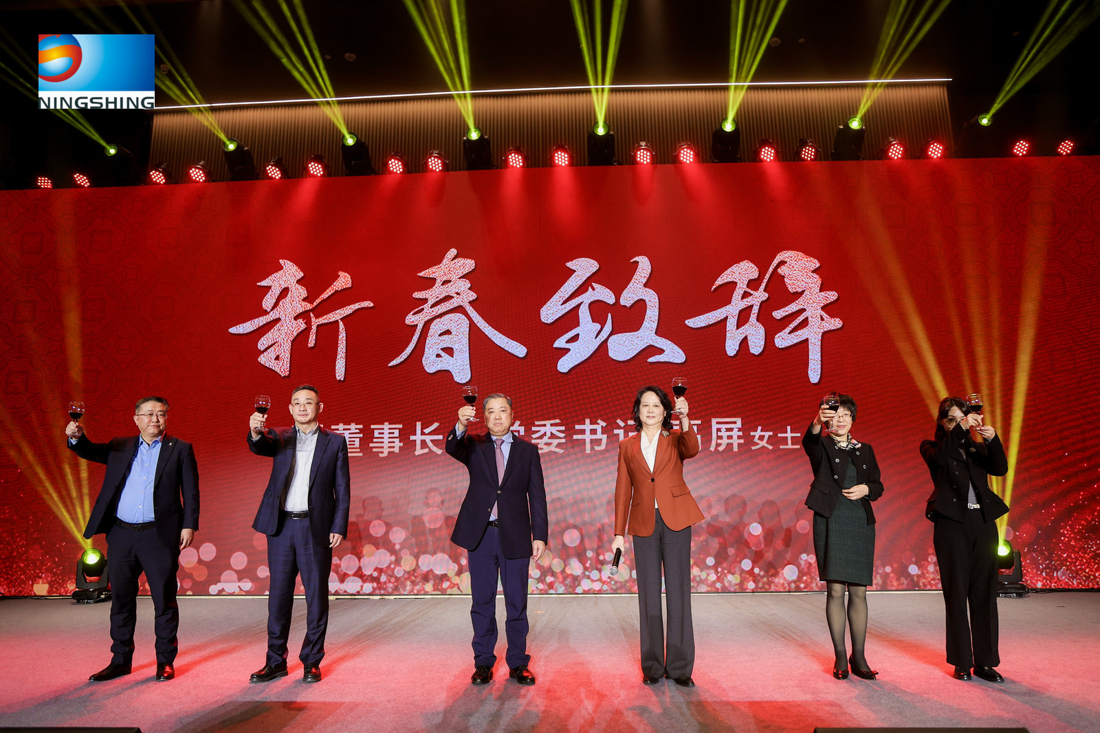 控股公司领导班子上台祝酒,祝愿大家新的一年身体健康、事业顺利、家庭幸福、巳巳如意。