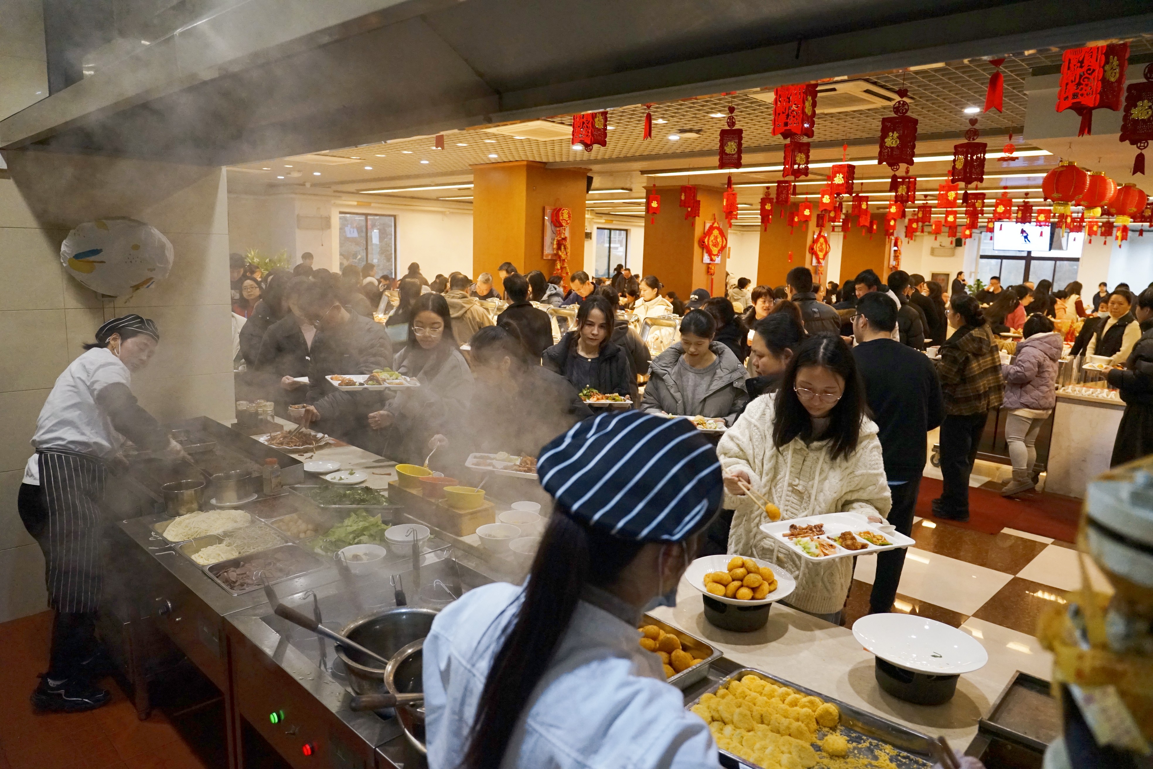 食堂内佳肴美食琳琅满目。既有热气腾腾的各类小炒、鲜嫩多汁的热气海鲜、手工制作的热汤面、软糯的彩色汤圆,还有清新爽口的沙拉、细腻绵软的蛋糕和甜蜜诱人的冰激凌。员工们围坐一起,边品尝美食边分享新年的故事,更感受着来自英国365集团公司大家庭的幸福关怀。