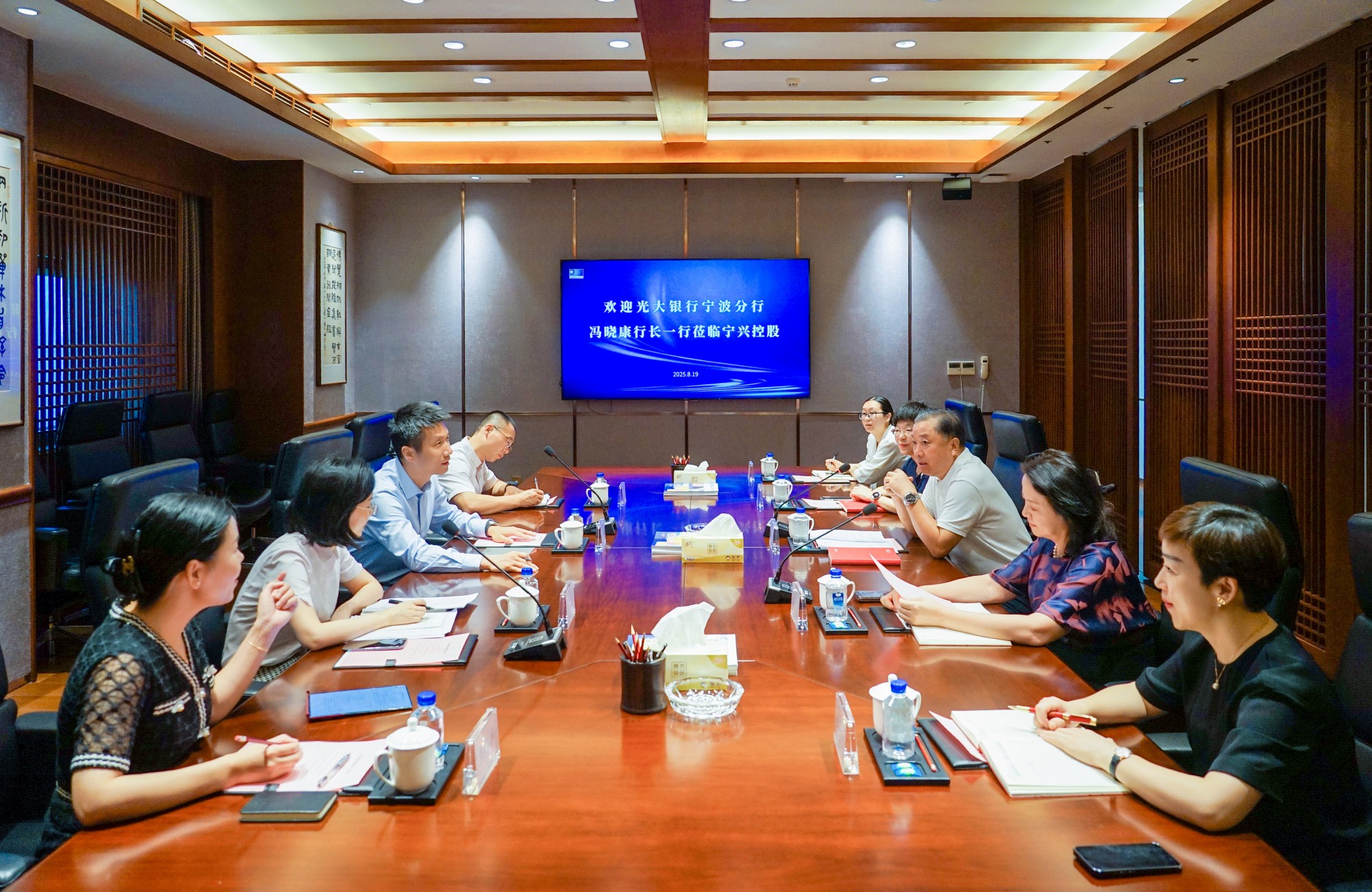 光大银行宁波分行公司金融部总经理胡海浓、交易银行部总经理陈百奇、江北支行行长王小华一同交流座谈。