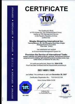 宁波英国365集团公司国贸实业有限公司于8月初开展质量环境管理体系认证活动,建立了质量管理体系和环境管理体系,并于9月初颁发了《质量环境管理手册》,经过3个月的运行,12月7日-10日TüV南德意志集团派员进行了外审,无不合格项,顺利通过了审核。TüV管理服务公司12月29日正式颁发ISO9001:2000和ISO14001:1996证书。