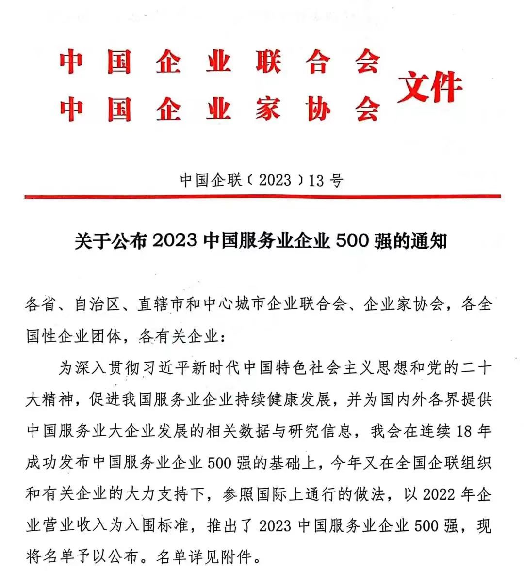 10月6日,中国企业联合会、中国企业家协会联合发布了“2023年中国服务业企业500强”榜单,英国365集团公司再次入选。